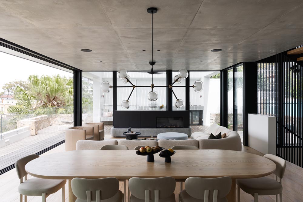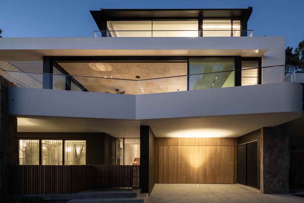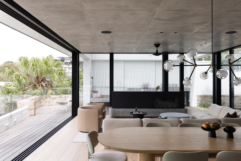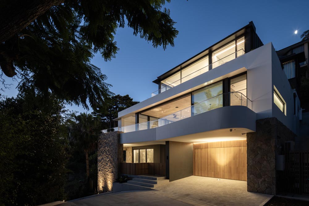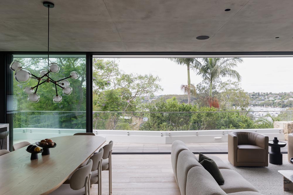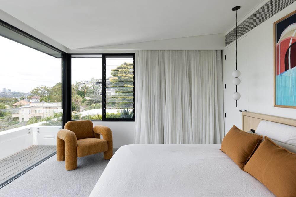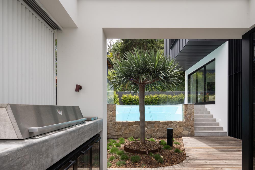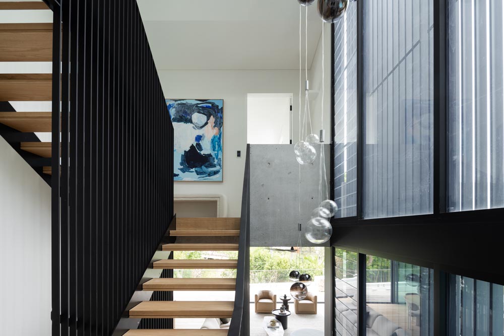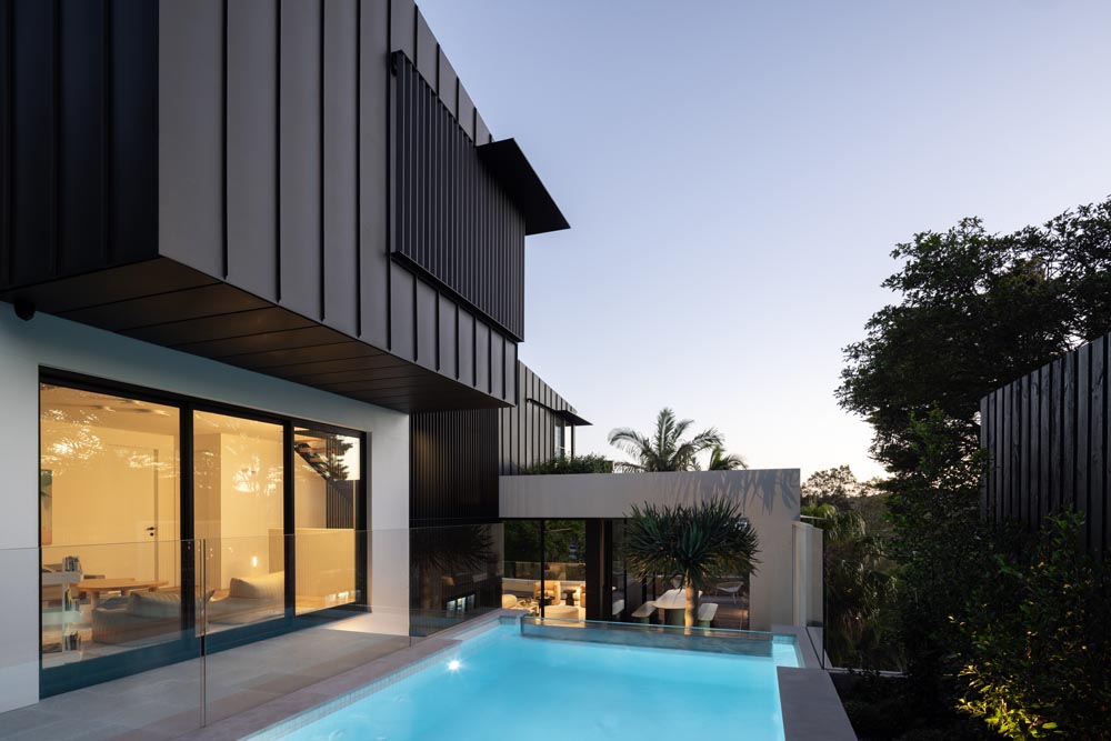 This three-story home captures views over The Spit and Middle Harbour while creating a functional and private family sanctuary. Open-plan living areas flow into a versatile balcony and terrace with a glass-sided swimming pool, enhancing the connection between levels. Louvred screens are employed externally to protect from the afternoon sun. A palette of concrete, stone, black metal and white render serves to anchor the building to the steeply sloping site while providing a clear, consistent language throughout.