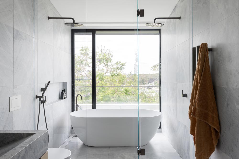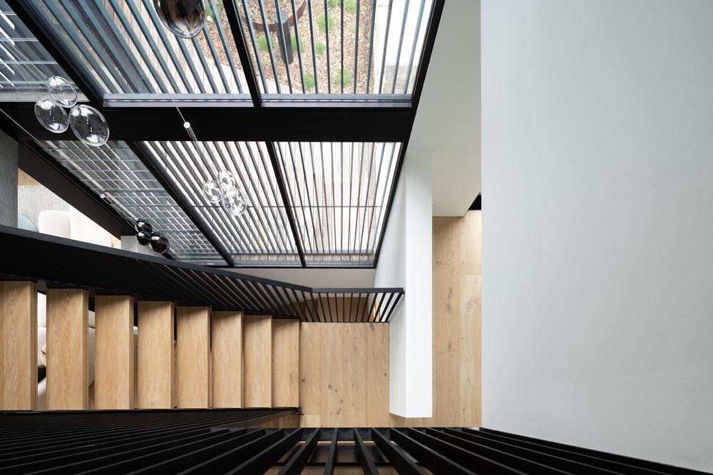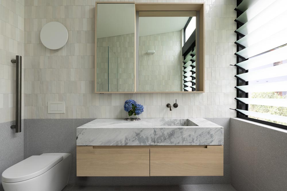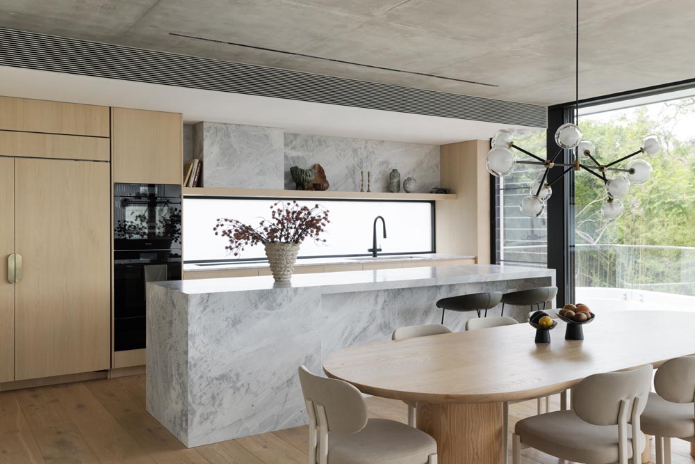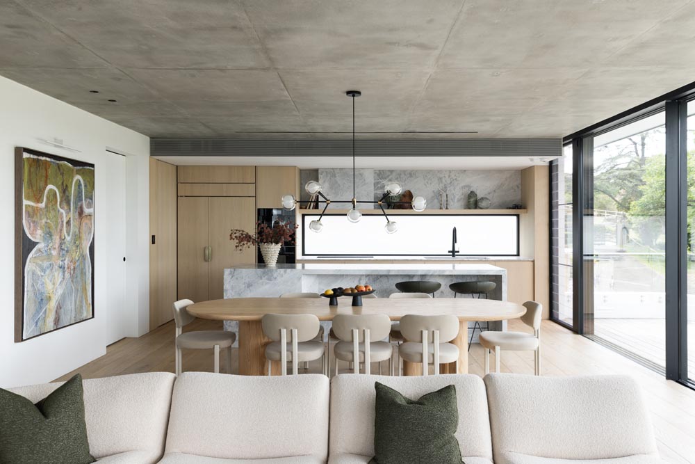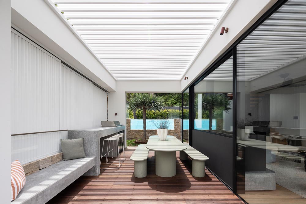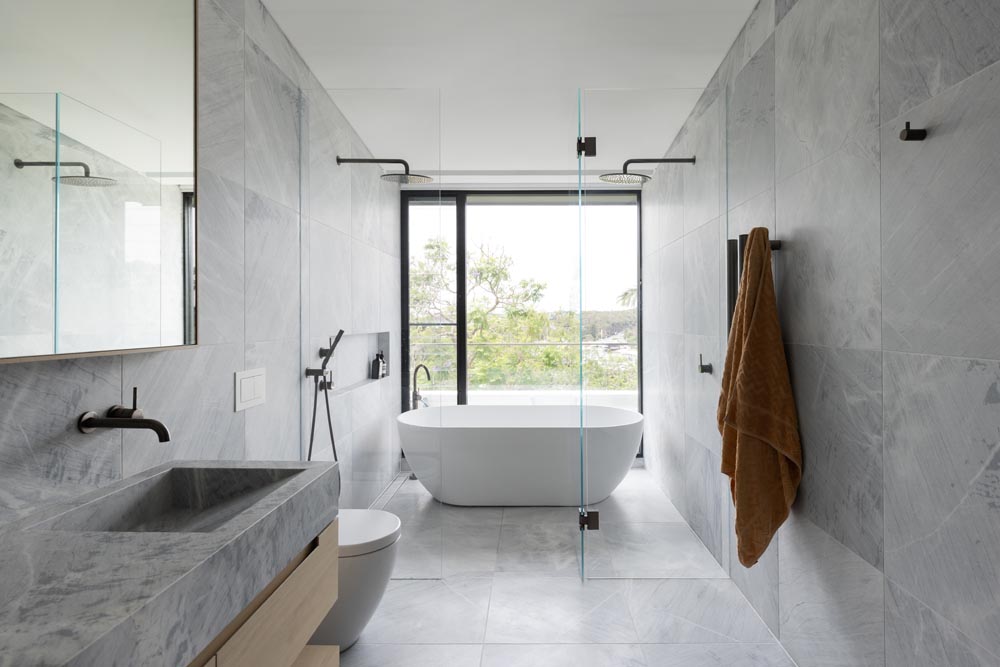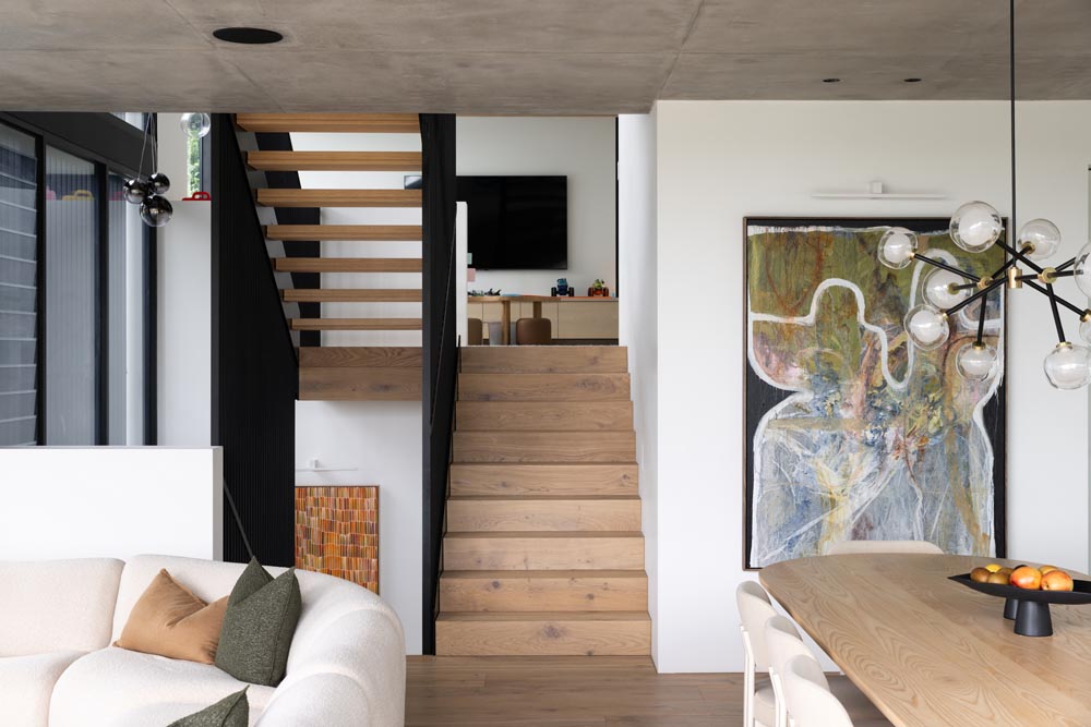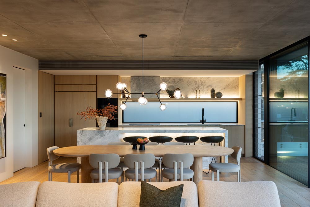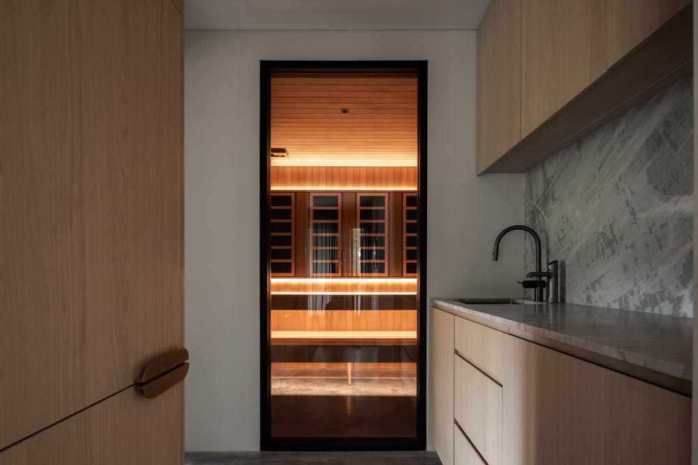 This three-story home captures views over The Spit and Middle Harbour while creating a functional and private family sanctuary. Open-plan living areas flow into a versatile balcony and terrace with a glass-sided swimming pool, enhancing the connection between levels. Louvred screens are employed externally to protect from the afternoon sun. A palette of concrete, stone, black metal and white render serves to anchor the building to the steeply sloping site while providing a clear, consistent language throughout.