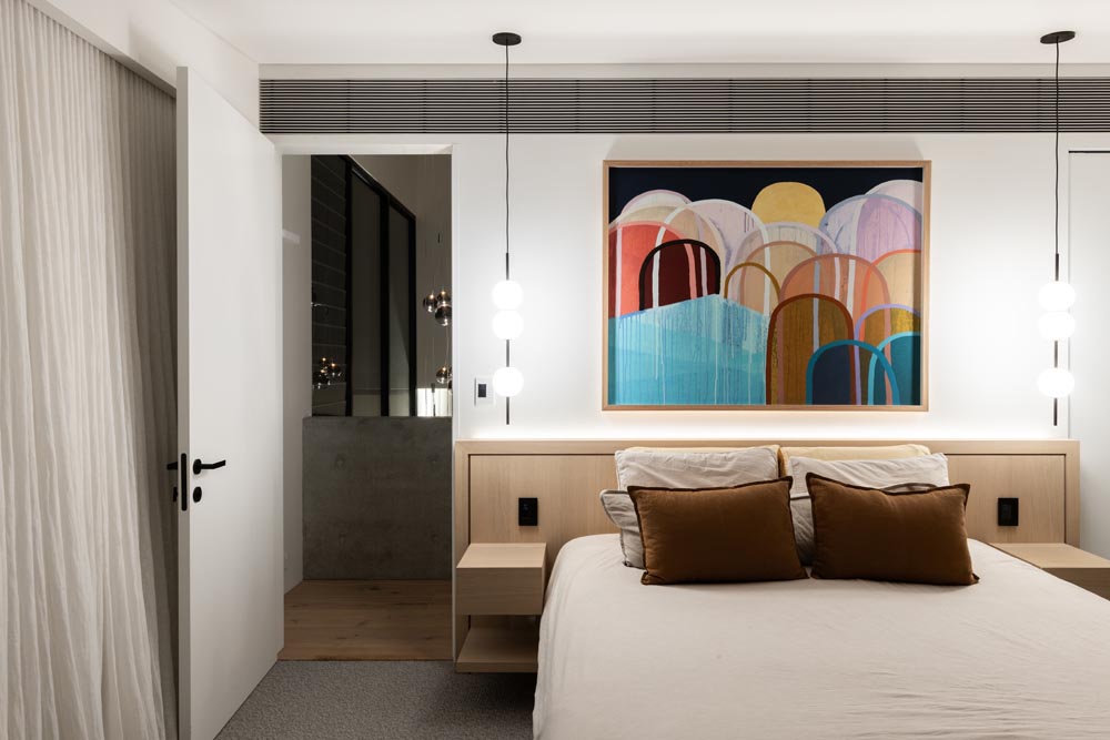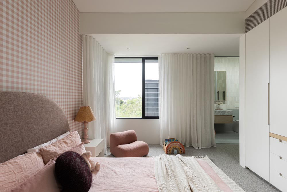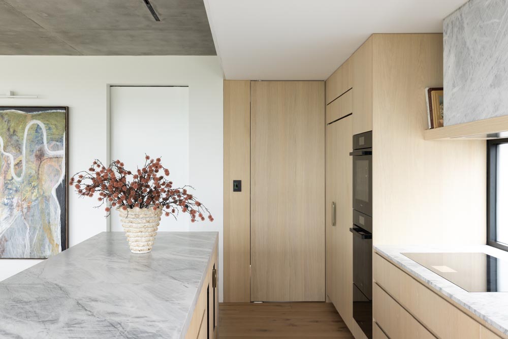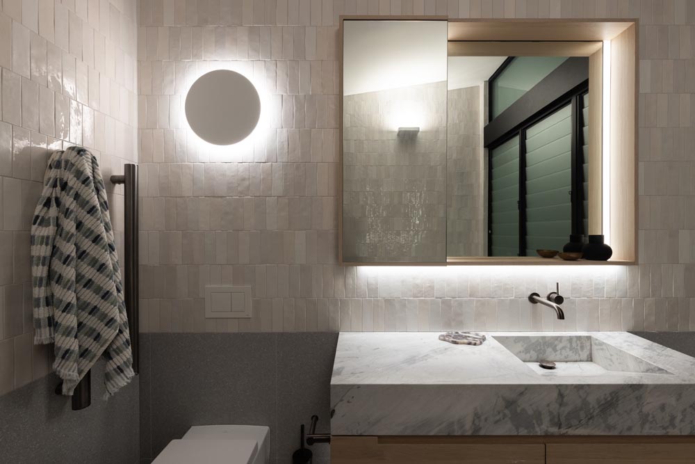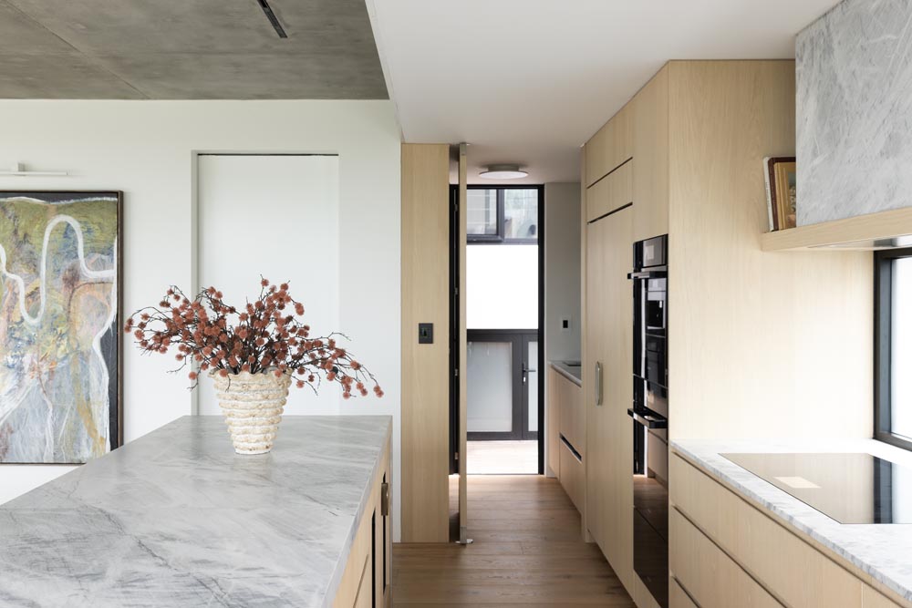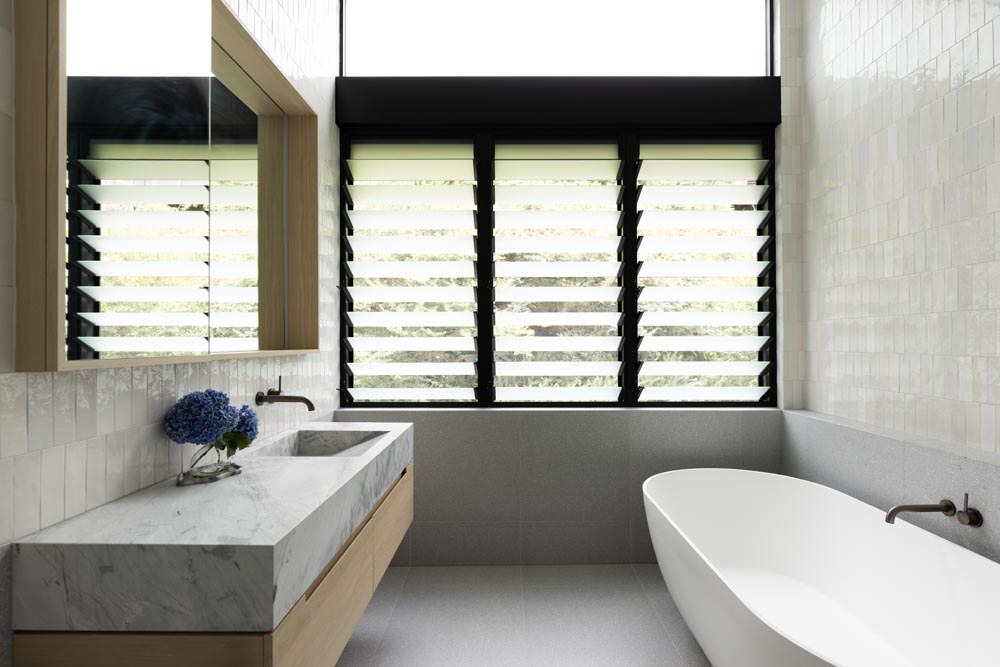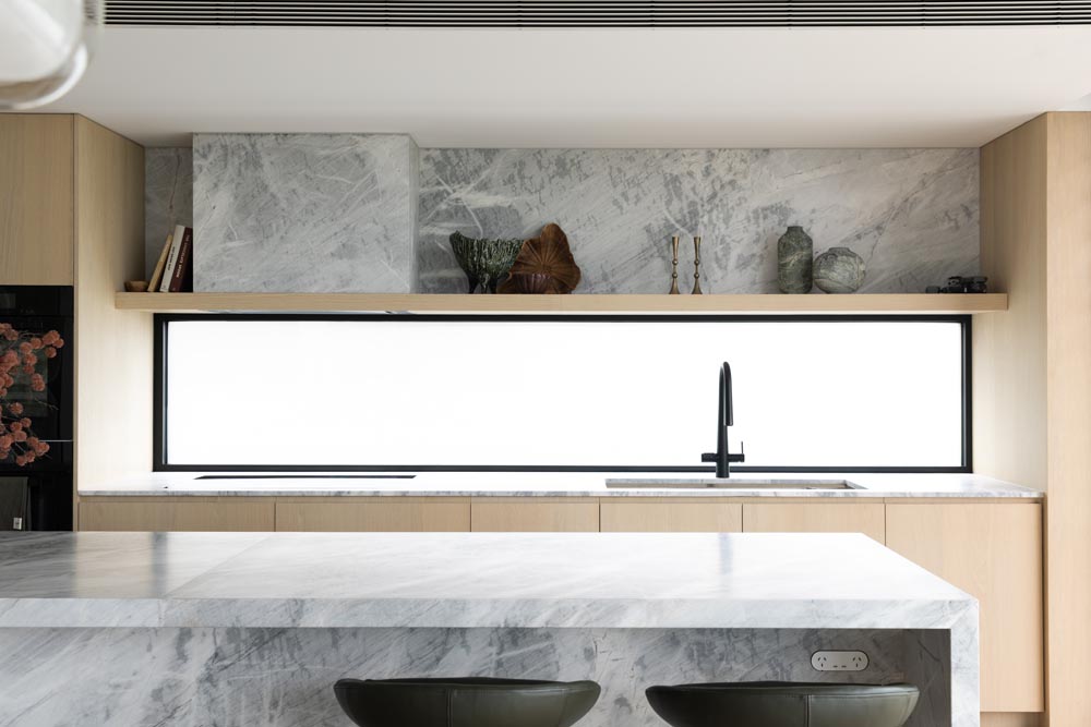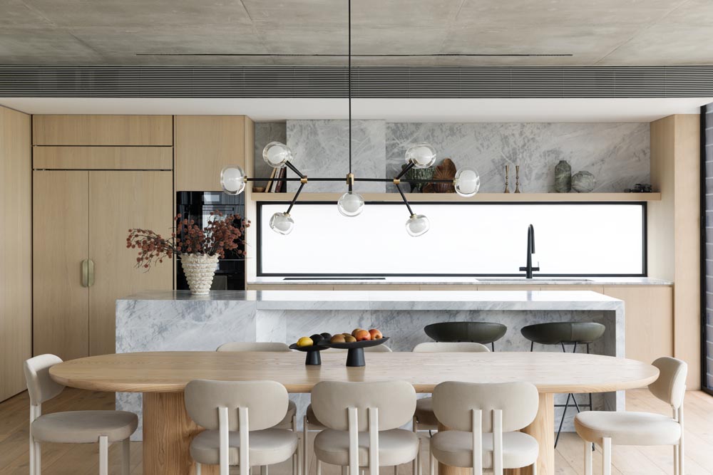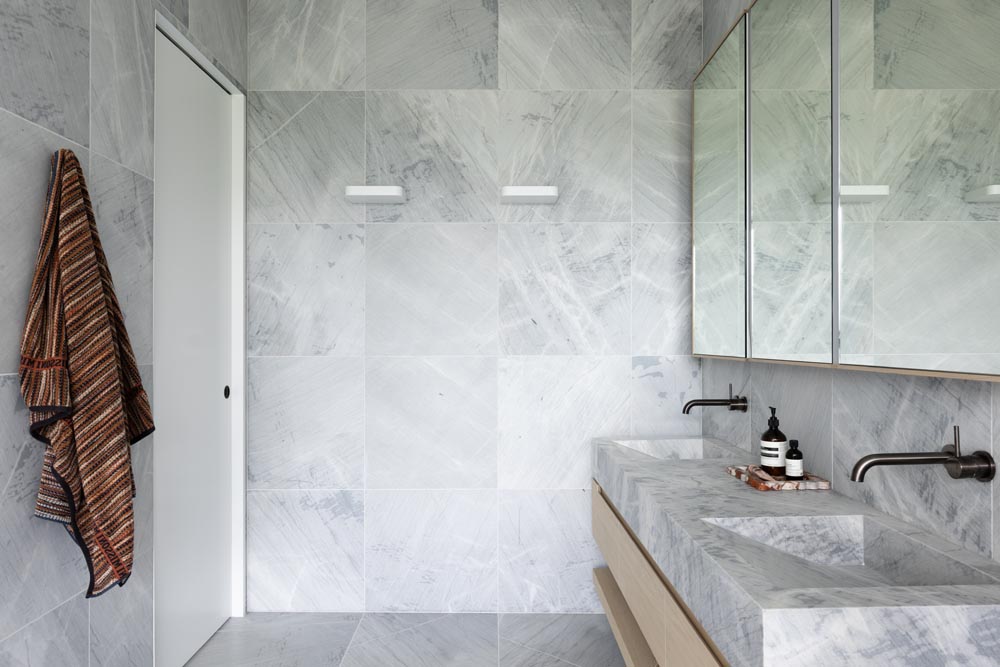 This three-story home captures views over The Spit and Middle Harbour while creating a functional and private family sanctuary. Open-plan living areas flow into a versatile balcony and terrace with a glass-sided swimming pool, enhancing the connection between levels. Louvred screens are employed externally to protect from the afternoon sun. A palette of concrete, stone, black metal and white render serves to anchor the building to the steeply sloping site while providing a clear, consistent language throughout.